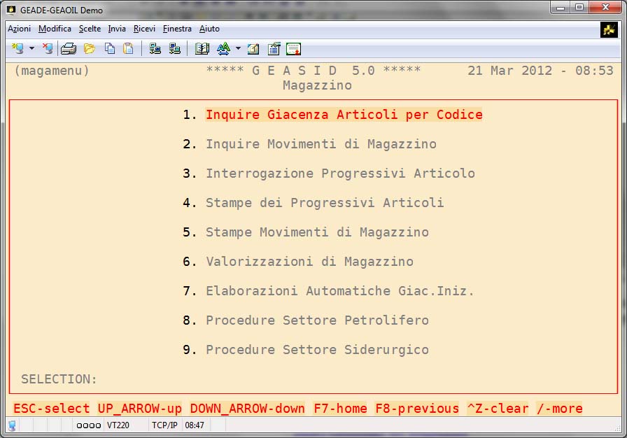 La procedura é costituita da una serie di moduli di uso generale che provvedono ad assolvere una serie di funzioni di carattere gestionale e di controllo della movimentazione di magazzino e di due gruppi di moduli specializzati per il Settore Siderurgico e Petrolifero.