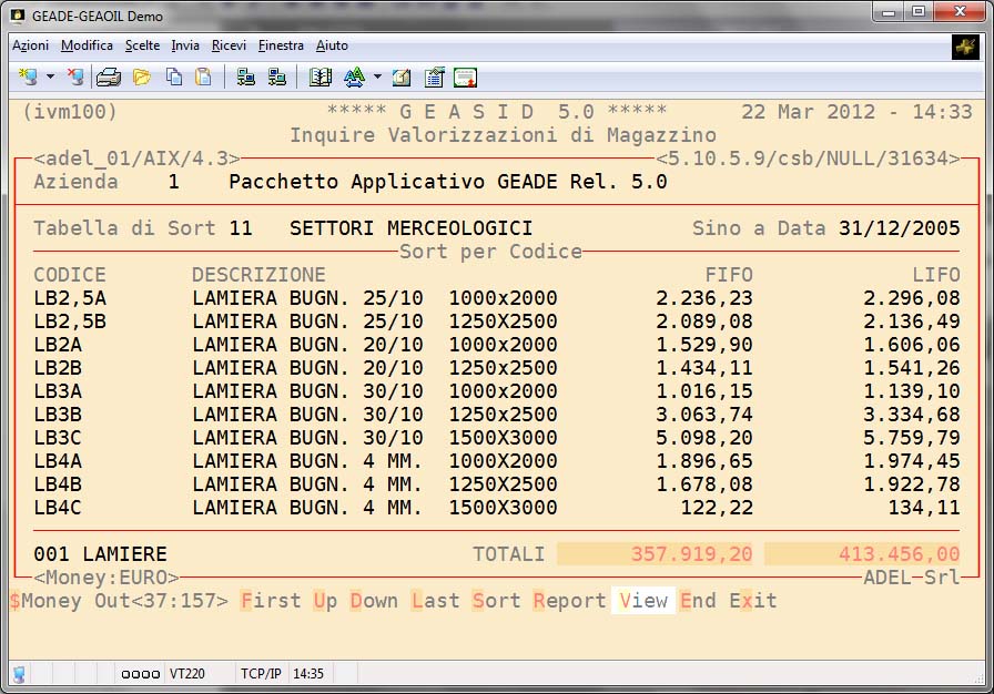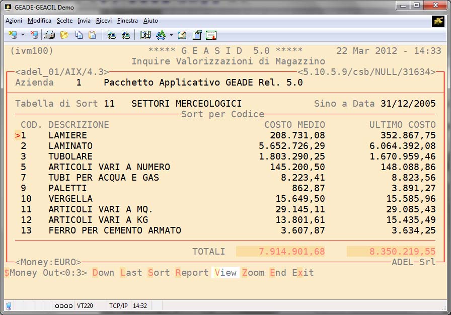 Il comando View consente di visualizzare, a rotazione, i valori accumulati nelle diverse modalità di calcolo per singolo prodotto e i valori unitari di Costo Medio e Ultimo Costo.