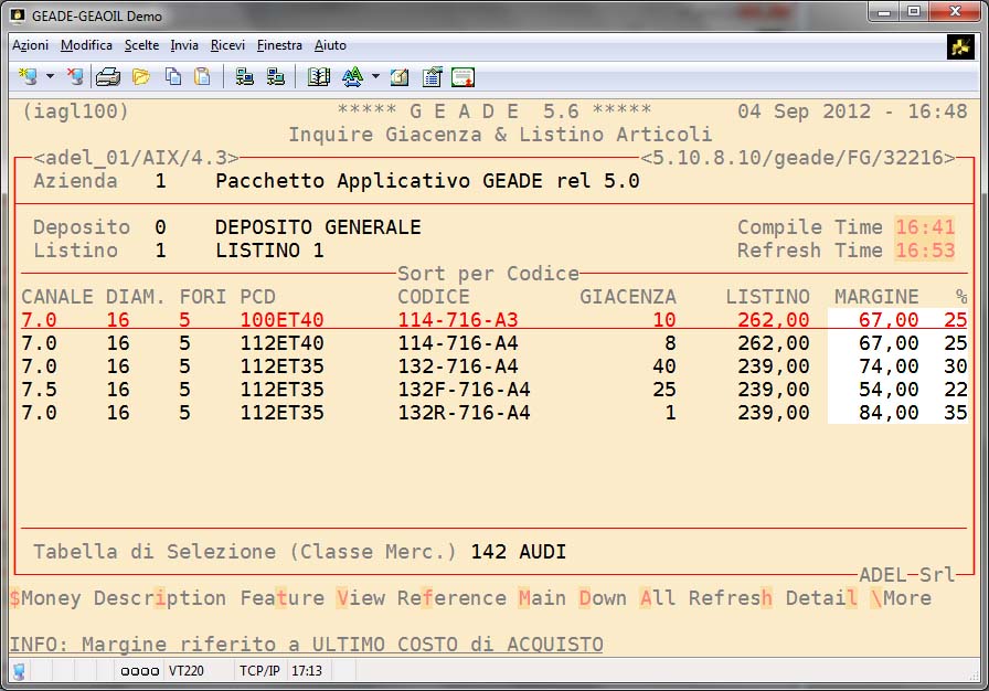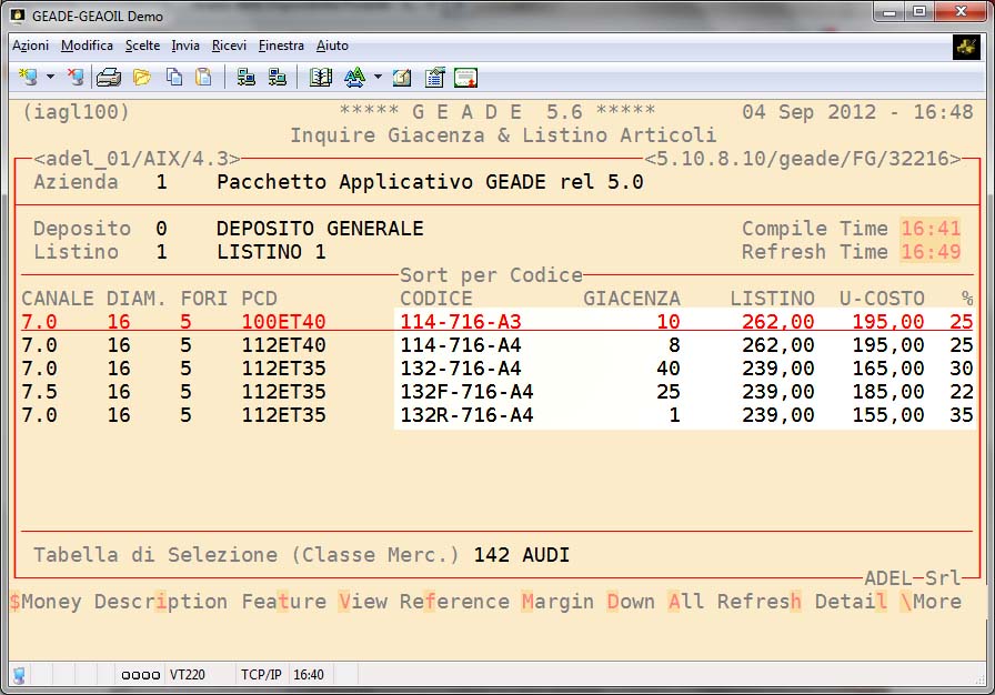 Con modalità di ricerca analoghe a quelle illustrate in precedenza è possibile visualizzare la giacenza, il listino e i costi (ultimo e medio) dei prodotti presenti a magazzino e rispondenti alle caratteristiche tecniche selezionate dell'operatore.