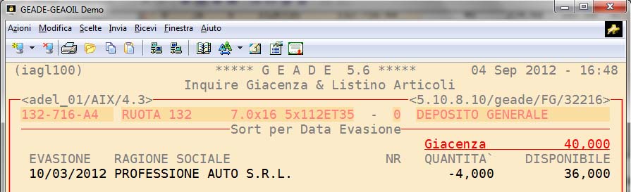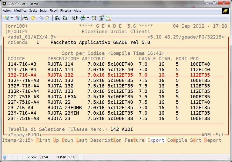 Selezionato l'articolo (nell'esempio 132-716-A4) il comando Export trasferisce automaticamente il codice nel documento in elaborazione.