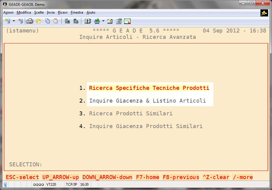 L'attivazione del comando rende disponibili i meccanismi di ricerca già illustrati nella precedente sezione Inquire delle Specifiche Tecniche Articoli proponendo a video il risultato della selezione.