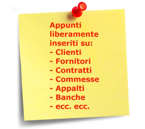 Le Note Aziendali sono un vero e proprio block-notes centralizzato e collegato alla base dati, che permette agli operatori di inserire e/o consultare, sulla base delle abilitazioni previste dalla procedure di autenticazione, informazioni sui principali archivi di base (clienti, fornitori, banche, ecc.).