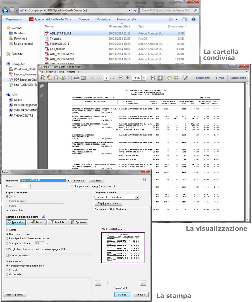 In sostanza al momento della creazione il report è realizzato contestualmente in formato testo nello Spool di Stampa e in formato PDF in una apposita cartella resa disponibile sulla LAN Aziendale con il nome PDF Spool su Geade Server.