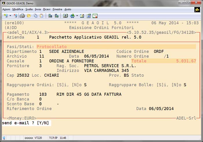 Completato l'inserimento dell'ordine ed eseguita la fase di stampa, se prevista dalle impostazioni documento, appare a piede maschera la richiesta di conferma per l'invio dell'e-mail.