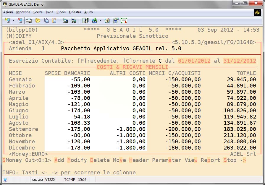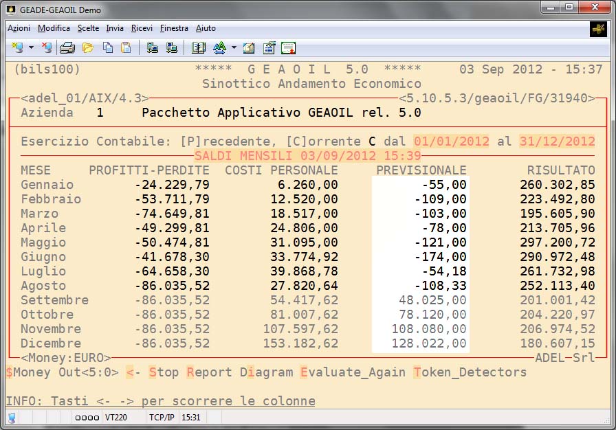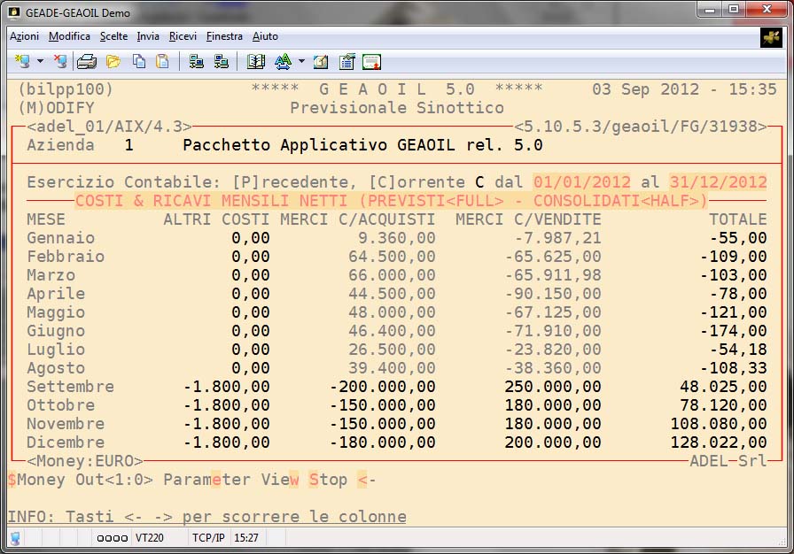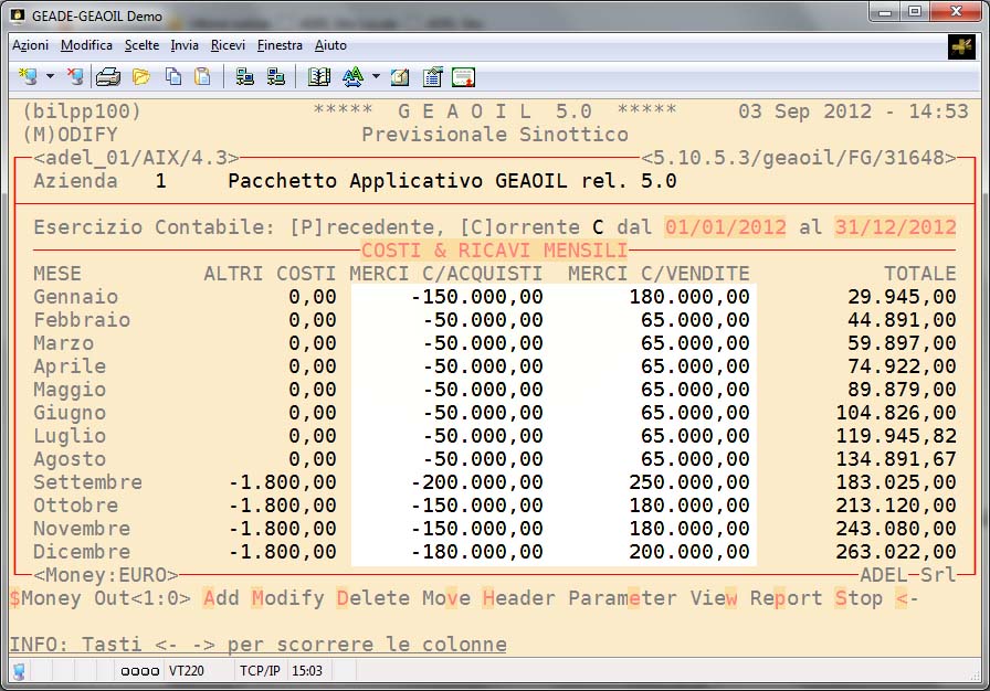In questo modo la movimentazione del conto nel mese neutralizza gli effetti della previsione cui subentra l'effettiva movimentazione contabile (si osservino in maschera le colonne Acquisto Merci e Vendite).
