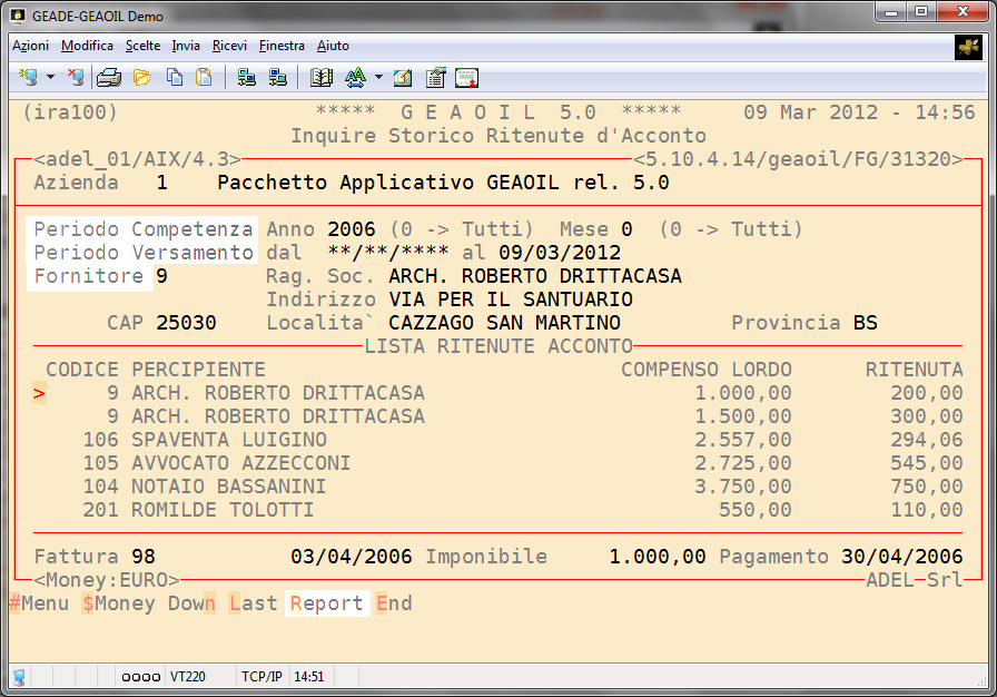 L'utente può consultare agevolmente l'archivio storico delle ritenute d'acconto indipendentemente dall'esercizio contabile in corso selezionandole per periodo di competenza, versamento e percipiente.