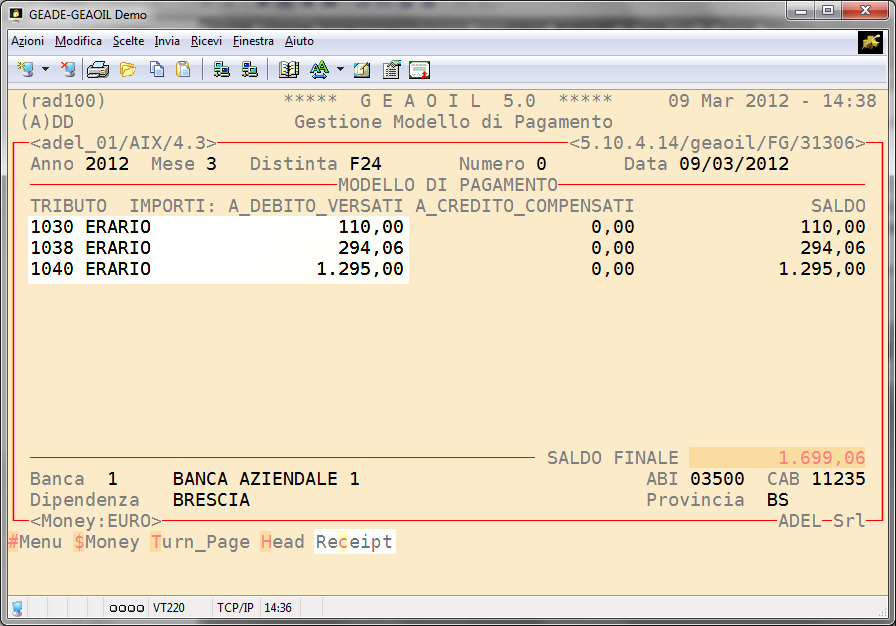 Al momento della chiusura è necessario procedere alla stampa del prospetto per la compilazione del modello F24 (comando Receipt).