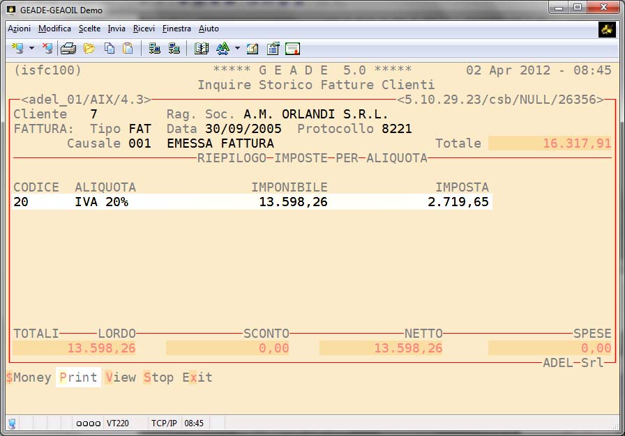 Con il comando Print si può ottenere la stampa del brogliaccio, o del modello personalizzato, della fattura.