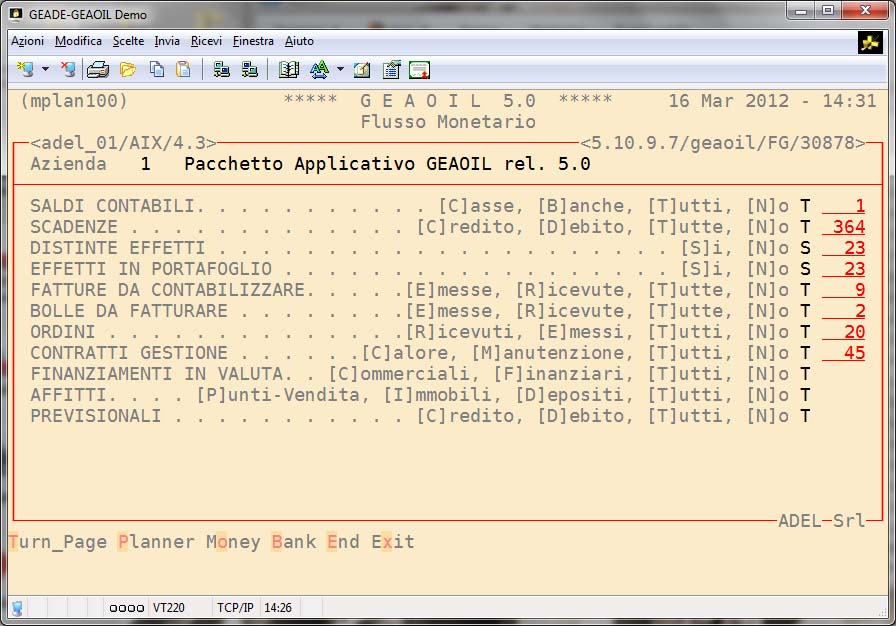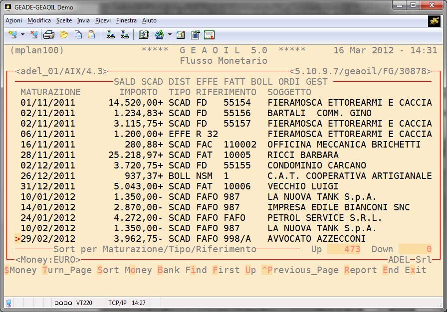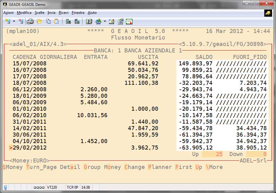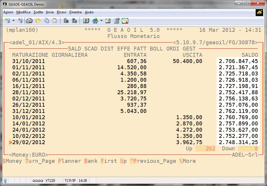 La procedura sulla base della movimentazione contabile consolidata, degli Ordini in essere, delle Consegne non ancora fatturate, delle Fatture non ancora contabilizzate, delle Partite Aperte, degli Effetti non ancora scaduti o nel rischio, è in grado di sviluppare una simulazione per data del flusso monetario dell'azienda.