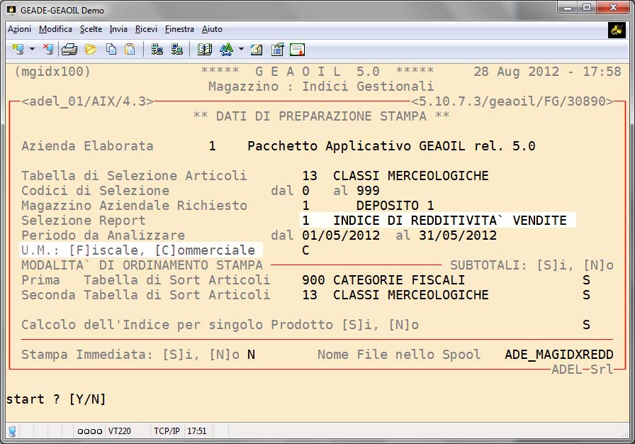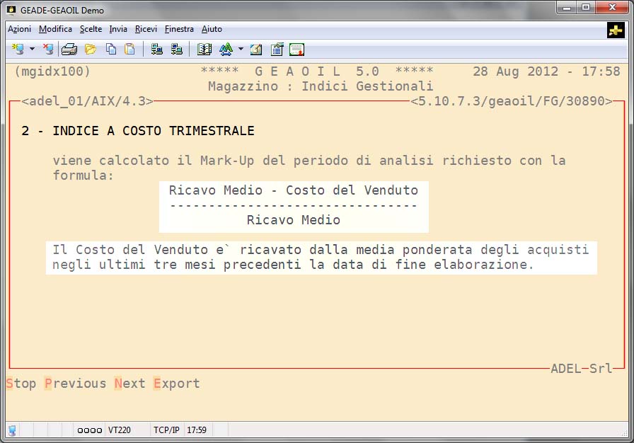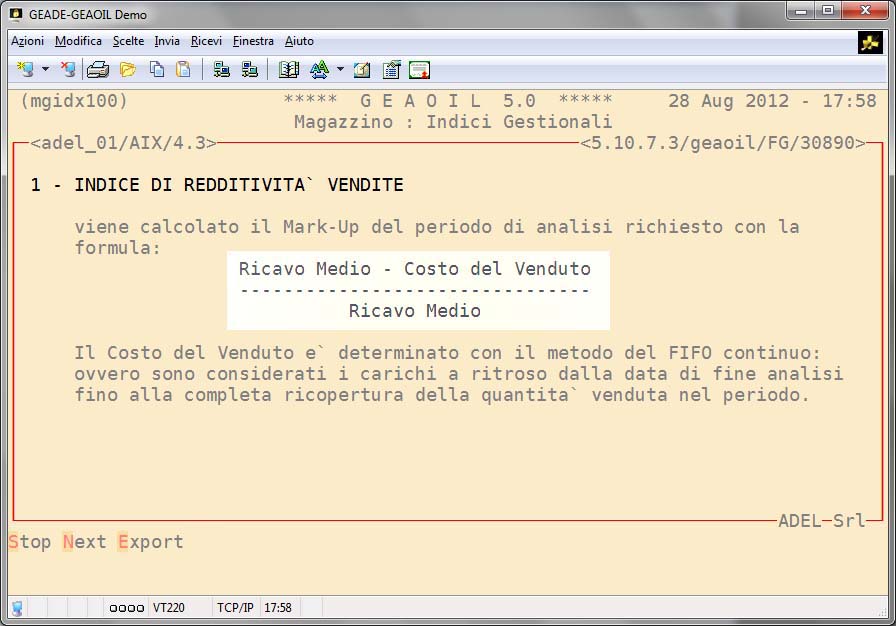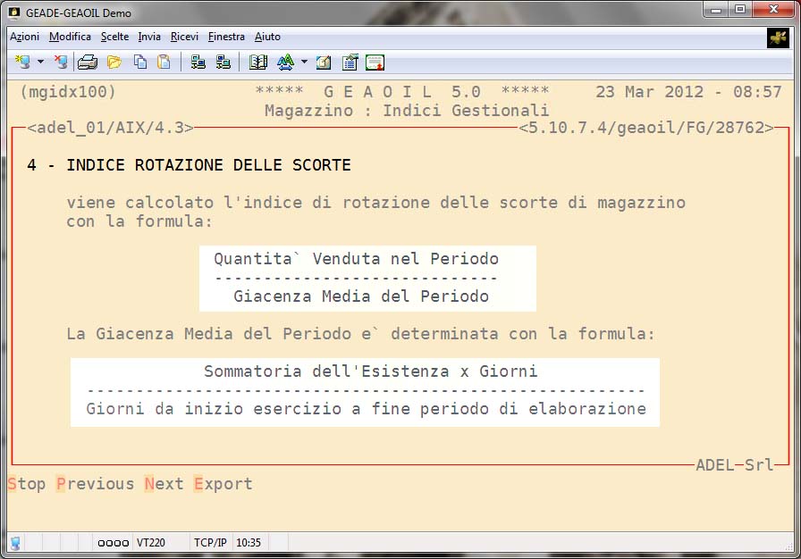 La procedura fornisce dei tabulati di analisi dei pricipali indici di magazzino per periodi a scelta dell'utente e senza vincolo all'anno contabile aziendale.