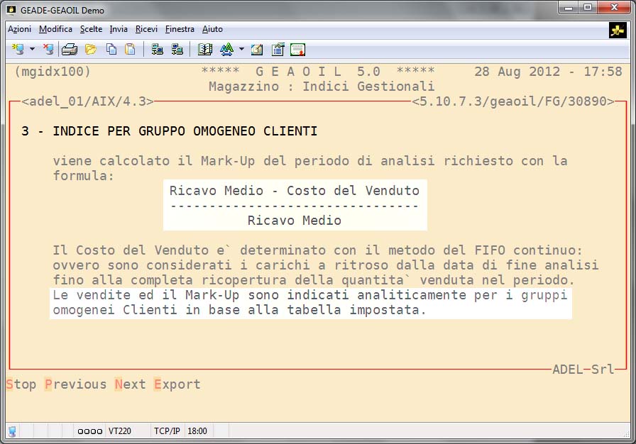 - Indice di Redditività per Gruppo Omogeneo Clienti: il tabulato ripropone il calcolo del mark-up variando il meccanismo di determinazione del costo del venduto ed indicandolo per gruppo omogeneo di clienti (es: privati, rivenditori, industrie, ecc.).