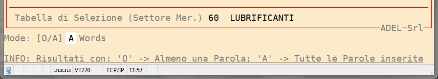 La ricerca si attiva mediante il comando Mining; confermato o variato il settore prodotti in cui operare la ricerca compare a video la predisposizione della modalità di ricerca (O = almeno una parola tra quelle digitate, A = tutte le parole digitate) e il campo di ricerca delle parole.