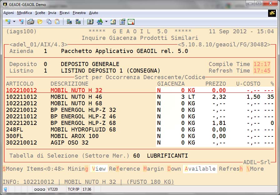 Completata fase di ricerca è possibile, mediante il comando View, visualizzare la giacenza, il listino e i costi (ultimo e medio) dei prodotti codificati a magazzino e rispondenti ai criteri di selezione definiti dell'operatore.