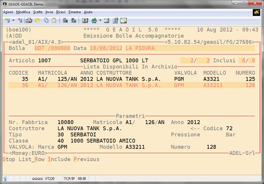 Al momento dell'emissione del documento di consegna del serbatoio in comodato la procedura fornisce l'elenco dei serbatoi disponibili in deposito.