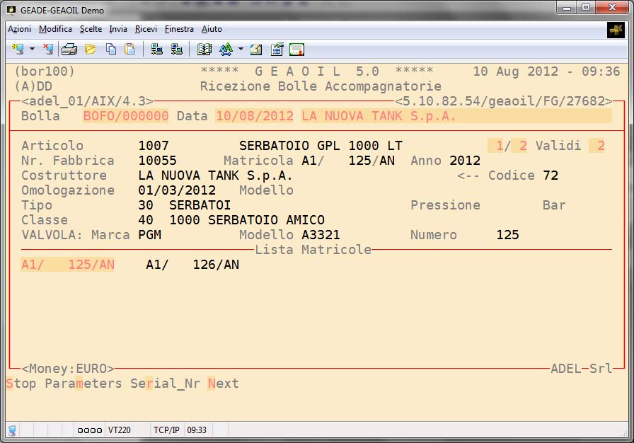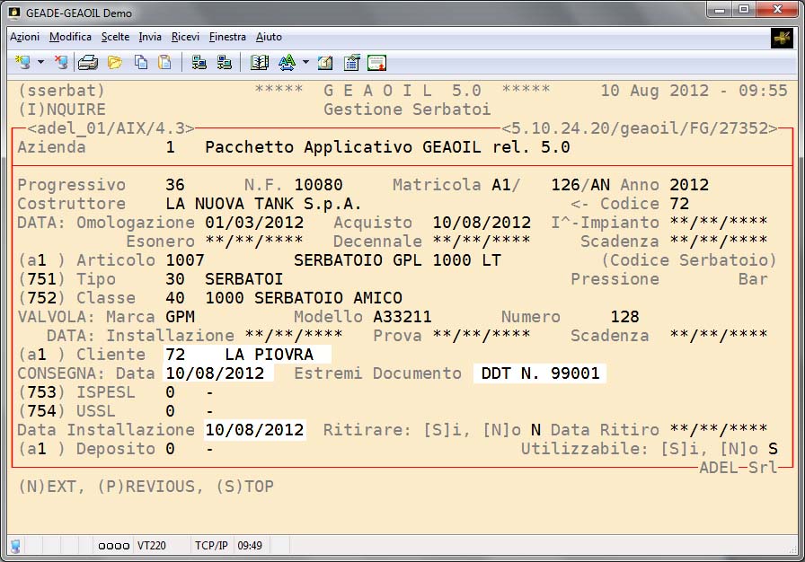 Il censimento e la creazione dell'anagrafica serbatoi sono contestuali dell'arrivo in deposito degli stessi durante l'inserimento del documento di carico.