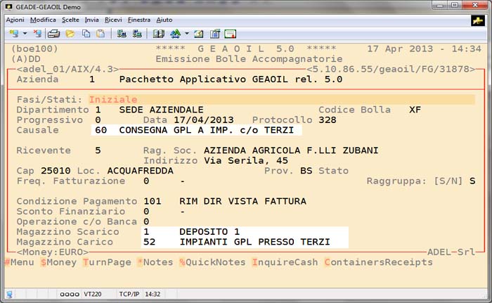 Questa impostazione risulta particolarmente utile all'atto della consegna del prodotto all'impianto associato al Conto Deposito, infatti selezionando la causale documento specifica i depositi interessati al trasferimento di prodotto sono automaticamente caricati nella testata del documento.