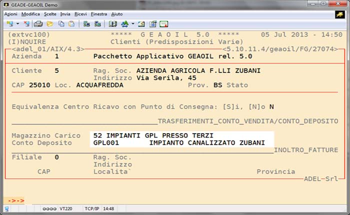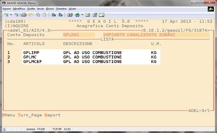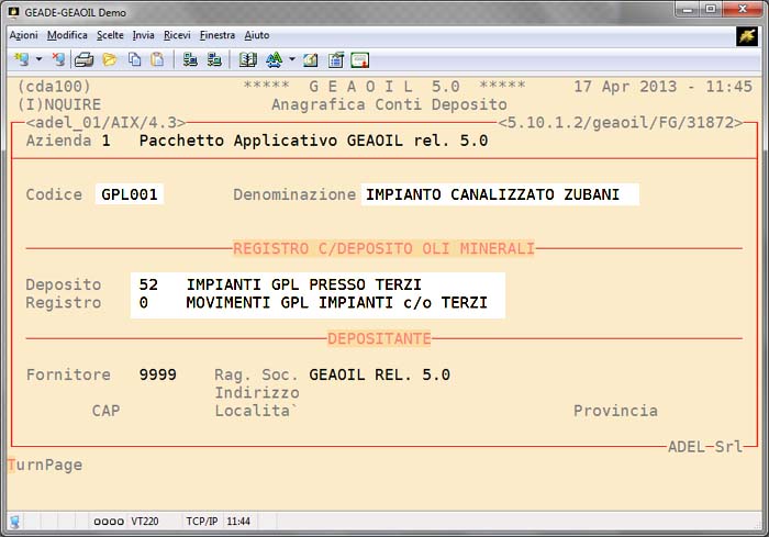 Per ogni serbatoio installato presso l'utente finale è possibile attivare un Conto Deposito assegnandogli una sigla identificativa.
