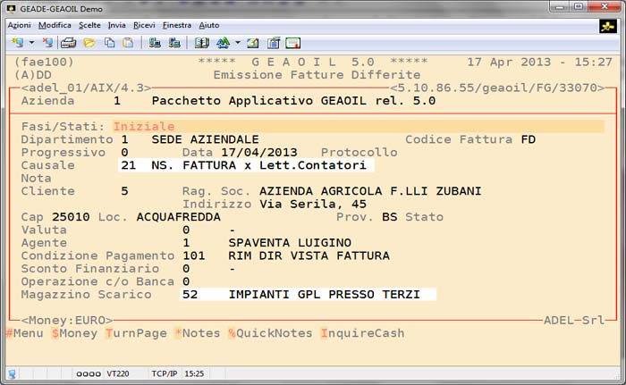 In questa applicazione si assume che il serbatoio installato presso l'utente finale sia a tutti gli effetti un proprio Conto Deposito Esterno; che la merce ad esso trasferita rimanga di proprietà dell'Azienda e che la vendita si configuri attraverso la fatturazione del prodotto giacente effettivamente consumato dall'utente.