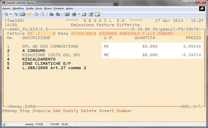 Nell'esempio della figura precedente si è utilizzato il codice prodotto predisposto per il caricamento automatico della riduzione dell'accisa in grado di comporre la fattura come nella figura successiva.