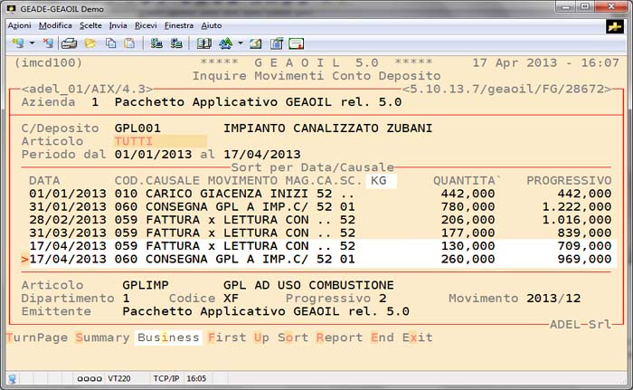 Con le stesse modalità l'insieme dei Conti Deposito può essere visualizzato mediante la procedura Inquire Movimenti per Gruppo, selezionando il deposito aziendale riepilogativo della movimentazione (nelle figure la vista Summary).