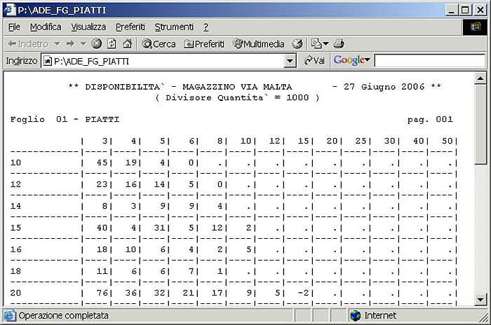 Per soddisfare le esigenze di analisi della disponibilità di prodotto da parte degli operatori commerciali preposti alla ricezione ordini è possibile predisporre una rappresentazione dei dati di disponibilità in forma di foglio elettronico.