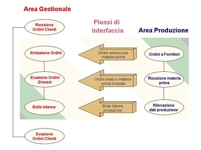 Nell'esempio il trasferimento delle transazioni risulta monodirezionale in quanto solo l'area produzione invia informazioni al Sistema Gestionale, non risultando necessario per la produzione ricevere gli ordini in essere ricevuti dai clienti.